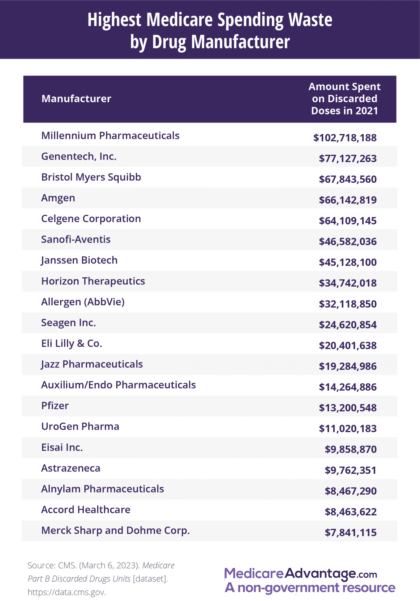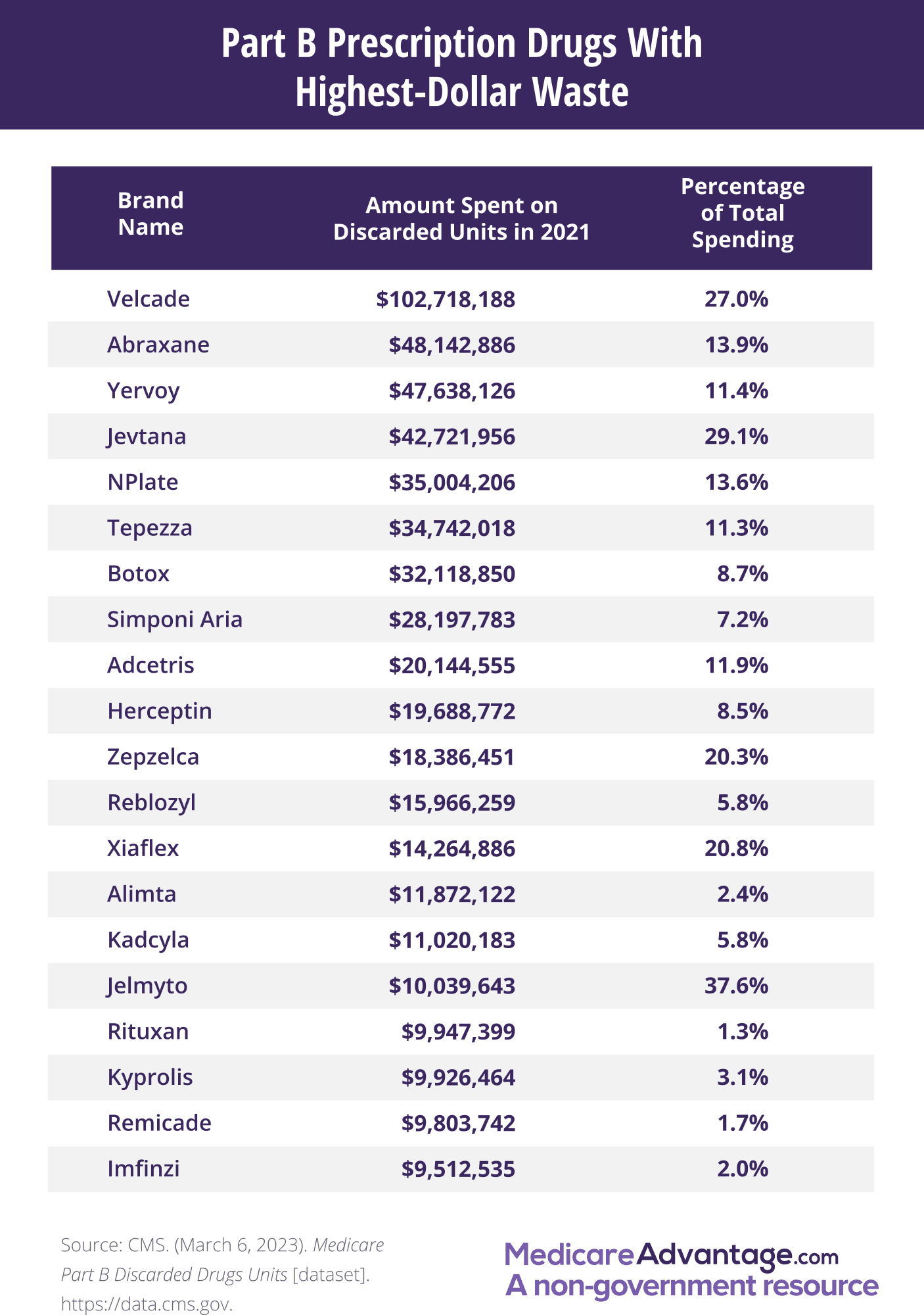 - Medicare wasted at least 20% of its spending per drug on 16 different drugs due to discarded doses that were billed to Medicare. The combined cost of these discarded units was more than $204 million, more than one-quarter of all Medicare Part B drug waste in 2021.