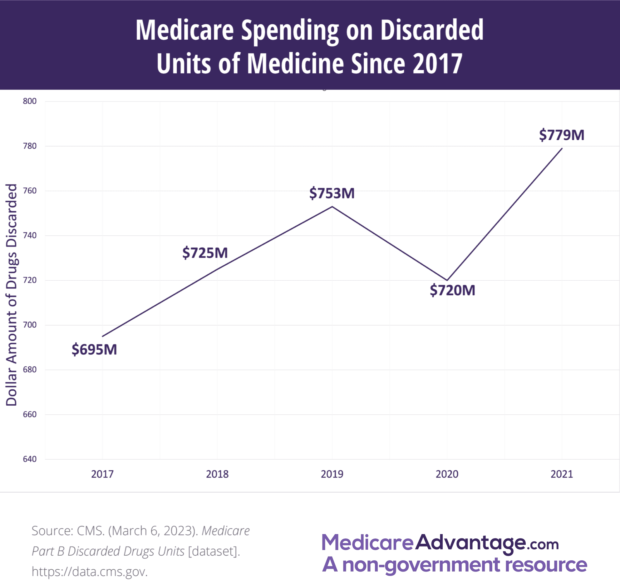 Our analysis of the most recent data provided by the CMS finds that more than $779 million of Medicare spending was wasted on discarded units of drugs in 2021. Medicare has spent more than $3.6 billion on unused medication since 2017.